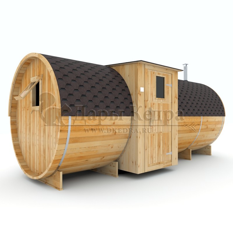 • Баня-бочка круглая из кедра 6 метров Это изделие круглой вытянутой формы с тремя отделениями: раздевалкой, моечной и парной. Во всех трех отделениях с обеих сторон установлены лавочки из кедра. Печь находится в парилке около дальней стены. Для удобства пользования в бане висят полочки из кедра и вешалка в раздевалке. Время растопки такой бани не превышает 30 минут. По вашему желанию баню-бочку можно дополнить печью с внешней загрузкой, благодаря которой весь мусор после топки останется на улице. Круглая баня-бочка не требует полноценный фундамент, поэтому при необходимости ее можно перенести в другое место. Обращаем Ваше внимание, что в стандартную комплектацию бани входят лавки в парной с обеих сторон. Дополнительно можно заказать полок открытого или закрытого типа! Кедр обладает ароматическими свойствами. Он не деформируется и влагоустойчив, при правильном уходе за деревом на нем не развиваются грибки и плесень.