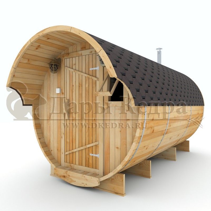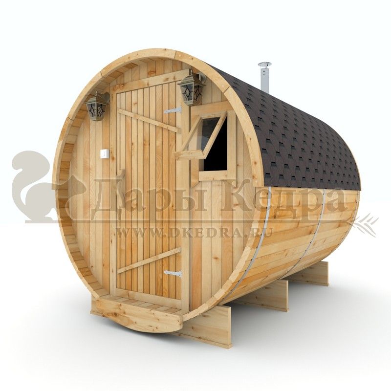 • Баня-бочка круглая из кедра с козырьком (все размеры) Это изделие круглой вытянутой формы. Козырек не только украшает баню, но и защищает оставленную обувь от дождя. Лавочки из кедра находятся по всей длине бани-бочки с обеих сторон. Печь расположена в парилке около дальней стены. Время растопки такой печи не превышает 30 минут. В зависимости от выбранного размера круглая баня-бочка с козырьком имеет следующую комплектацию: Круглая баня-бочка 2,5 метра - парилка; Круглая баня-бочка 3,5 и 4,5 метра - раздевалка, парилка; Круглая баня-бочка 5,5 метров - раздевалка, парилка, моечная. По вашему желанию ее можно укомплектовать печью с внешней загрузкой, благодаря которой весь мусор вовремя топки остается на улице. Круглая баня-бочка не требует полноценный фундамент, поэтому при необходимости ее можно перенести в другое место. Обращаем Ваше внимание, что в стандартную комплектацию бани входят лавки в парной с обеих сторон. Дополнительно можно заказать полок открытого или закрытого типа! Кедр обладает ароматическими свойствами. Он не деформируется и влагоустойчив, при правильном уходе за деревом на нем не развиваются грибки и плесень.